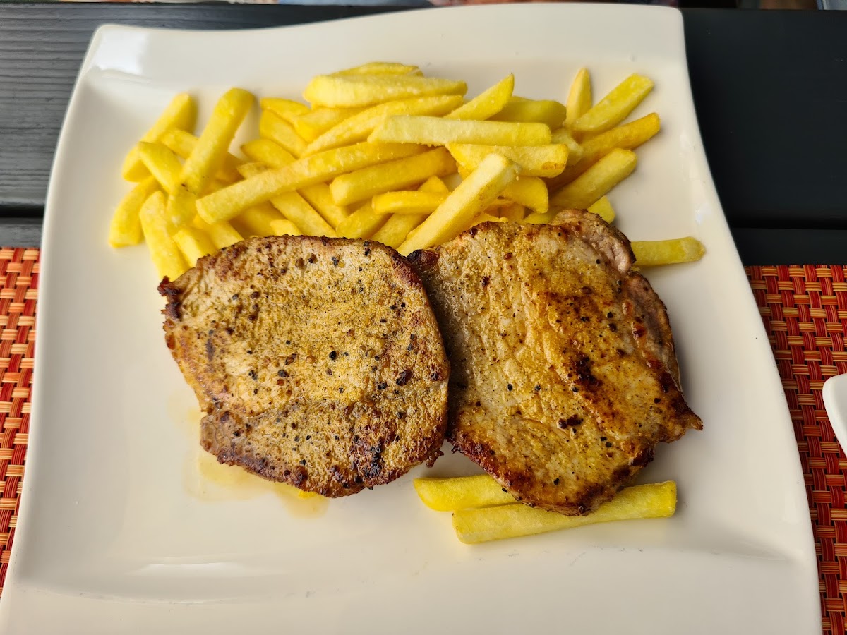 Zu Mittag bestellen wir uns hier gelegentlich Schnitzelsemmeln. Eine Semmel kostet € 4,80 und sie sind ihr Geld wert. Es sind stets zwei, heute sogar drei, Schnitzel drinnen und man ist danach wirklich satt. Dre einzige Verbesserungsvorschlag meinerseits, statt runder Semmeln, Langsemmeln verwenden.